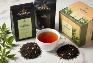Các gói trà đen Overtea cao cấp cùng với búp trà tươi và ly trà đã pha, biểu trưng cho chất lượng