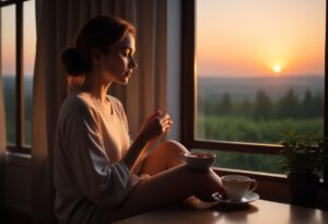 Người phụ nữ uống trà đen bên cửa sổ trong buổi hoàng hôn, thư giãn sau giờ làm việc.