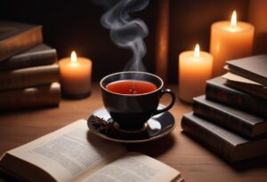 Tách trà đen nghi ngút khói và quyển sách, biểu trưng cho sự thư giãn cho dân văn phòng.